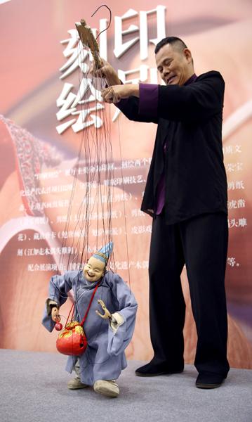 印刷刻绘主题展区主要分为印刷、刻绘两个板块,展示国家级非物质文化遗产代表性项目12项,包括雕版印刷技艺、剪纸(蔚县剪纸)、藏族唐卡(勉唐画派、勉萨画派)、皮影戏(华县皮影戏)等。